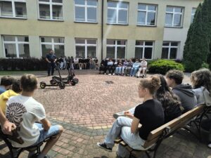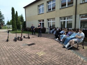 10.06.2025 r. uczniowie klas 6 i 7 wzięli udział w spotkaniu z przedstawicielami policji, które dotyczyło zasad bezpiecznej jazdy na hulajnogach oraz ogólnego bezpieczeństwa podczas zbliżających się wakacji.