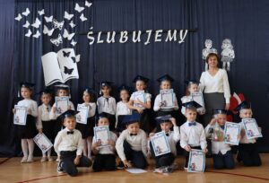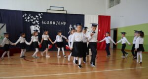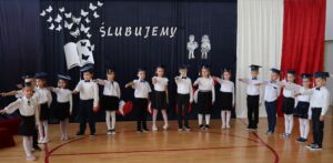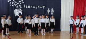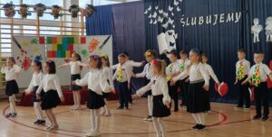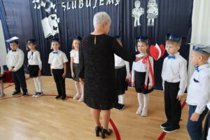 Druga część uroczystości miała charakter patriotyczny – uczniowie z dumą zaprezentowali wiersze nawiązujące do miłości do Ojczyzny i symboli narodowych. Następnie nadszedł najważniejszy moment uroczystości – złożenie ślubowania na sztandar szkoły. Z powagą i wzruszeniem pierwszoklasiści powtarzali rotę ślubowania, przyrzekając być pilnymi uczniami, szanować nauczycieli, rodziców i kolegów oraz kochać swoją Ojczyznę. Pani Dyrektor dokonała aktu pasowania poprzez dotknięcie ozdobnym ołówkiem ze słowami: „Pasuję ciebie na ucznia …”. Każdy pierwszoklasista otrzymał wówczas pamiątkowy dyplom i drobne upominki.