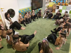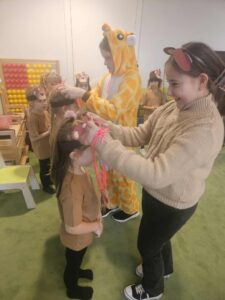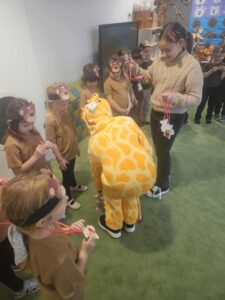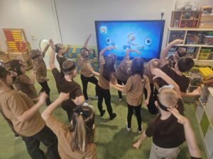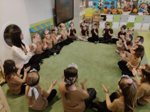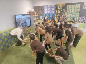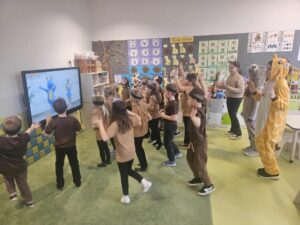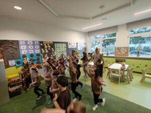 Podczas zajęć przedszkolaki wykonywały rytmiczne ruchy, tańczyły i powtarzały angielskie słowa oraz zwroty związane z bohaterami dnia. Starsi uczniowie wspierali młodsze dzieci, pomagając im w opanowaniu gestów i choreografii, a także zachęcając do aktywnego udziału.