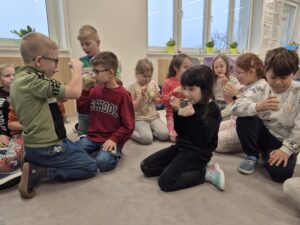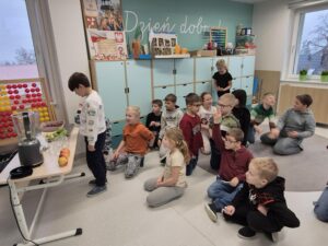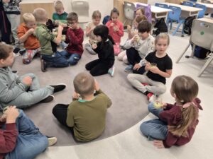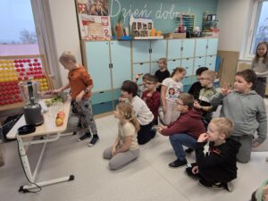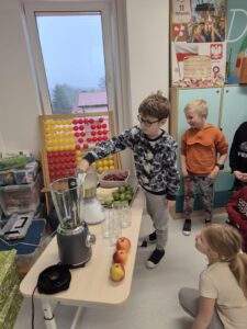 Na początku zajęć uczniowie rozmawiali o tym, dlaczego owoce są ważnym elementem codziennej diety. Dowiedzieli się, że dostarczają witamin, minerałów, błonnika oraz naturalnej energii potrzebnej do nauki i zabawy. Następnie każdy uczeń wybrał swoje ulubione owoce i przystąpił do pracy. Komponowanie smaków sprawiło wiele radości, a powstałe musy były nie tylko zdrowe, ale też wyjątkowo smaczne.