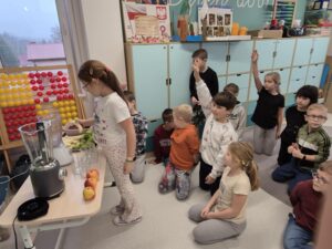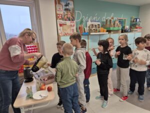 Klasa druga przygotowuje zdrowe musy owocowe w ramach programu „Owoce i warzywa w szkole”