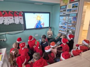 Następnie przyszedł czas na chwilę relaksu. Drugoklasiści zasiedli do wspólnego seansu filmowego, podczas którego nie mogło zabraknąć ulubionego kinowego przysmaku – popcornu. Dzieci oglądały bajki o tematyce mikołajkowej, co wywołało wiele uśmiechu i wprawiło wszystkich w jeszcze bardziej świąteczny nastrój.