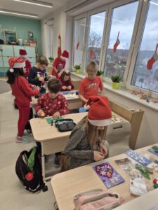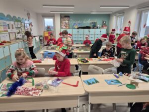 Już od rana dzieci dzieliły się wyjątkowym nastrojem, a sala lekcyjna zamieniła się w małą pracownię artystyczną. Uczniowie wykonywali papierowe Mikołaje oraz kartki świąteczne pełne kolorów i błyszczących ozdób. Kreatywność nie miała granic, a efekty ich pracy zachwycały starannością i pomysłowością.