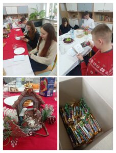 Uczniowie przynieśli poczęstunek, na którym znalazły się m.in. ciasta, pierniki, owoce oraz napoje. Każdy uczeń otrzymał upominek, co sprawiło wiele radości i wywołało uśmiechy na twarzach uczestników. Następnie odbył się wspólny poczęstunek oraz rozmowy przy świątecznej muzyce. Podczas spotkania panowała radosna i spokojna atmosfera, sprzyjająca integracji klasy. W trakcie wigilii odbyły się również gry , które umiliły wspólnie spędzony czas.