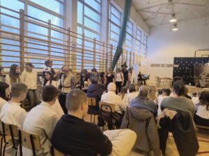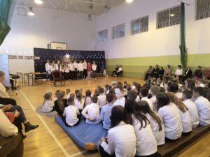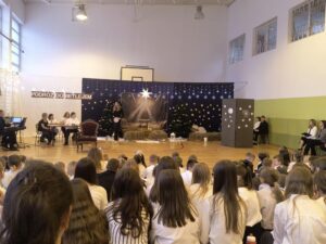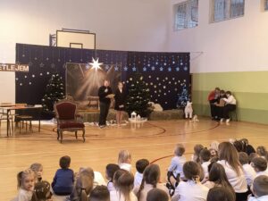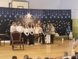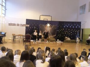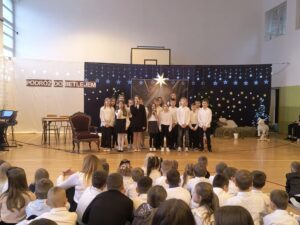 Jasełkom towarzyszyło wspólne kolędowanie uczniów klas IV–VII, które stworzyło radosną i świąteczną atmosferę. Szczególnym momentem było wykonanie przez uczennice klasy IV kolędy „Cicha noc” w wersji angielskiej i niemieckiej, co nadało spotkaniu wyjątkowy, międzynarodowy charakter. Wspólne śpiewanie kolęd wypełniło salę świątecznym blaskiem, ciepłem i wzajemną życzliwością, tworząc niezapomniany klimat Bożego Narodzenia.