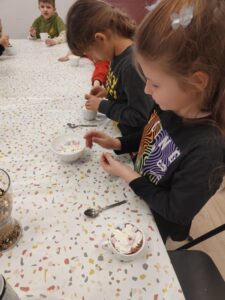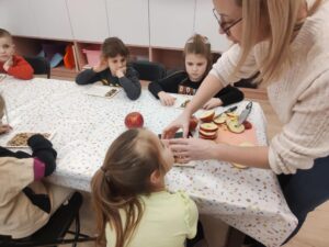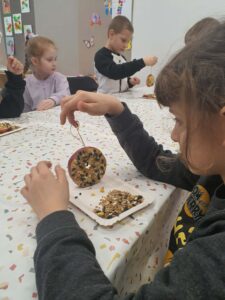 W części praktycznej dzieci przygotowały zdrowe smakołyki dla ptaków, wykorzystując m.in. jabłka i ziarna. Dzięki temu mogły utrwalić zdobytą wiedzę i przekonać się, że nawet proste działania mają duże znaczenie dla przyrody. Przygotowany pokarm został rozmieszczony w pobliżu szkoły. Na zakończenie spotkania czekała na wszystkich miła niespodzianka – gorąca czekolada, która była przyjemnym podsumowaniem wspólnie spędzonego czasu. Dziękujemy za ciekawą lekcję przyrody!