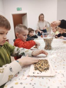 Dzieci dowiedziały się, dlaczego dokarmianie zwierząt zimą jest ważne oraz jak robić to w sposób właściwy. Poznały rodzaje ptasich przysmaków i uczyły się rozpoznawać różne gatunki ziaren oraz nasion, które mogą stanowić wartościowy pokarm w chłodne dni. Wiedza była przekazywana w przystępnej formie, dzięki czemu pierwszoklasiści chętnie włączali się w rozmowę i dzielili własnymi spostrzeżeniami. Z pasją opowiadały, w jaki sposób pomagają ptakom na własnych podwórkach.