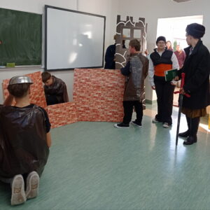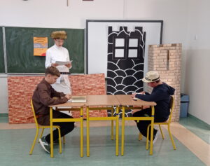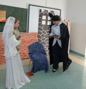 Na zajęciach przygotowują cyklicznie przedstawienia oparte na motywach lektur szkolnych i prezentują na forum szkoły.