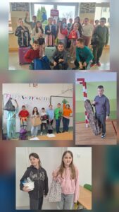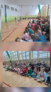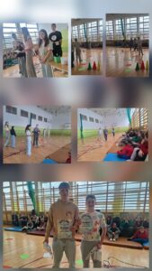 Kolejnym punktem dnia była szkolna gra „Eko-Mat”, przygotowana i poprowadzona przez uczniów klas VI i VIII – serdecznie dziękujemy za zaangażowanie i świetną organizację! W zabawie najpierw wzięli udział uczniowie klas 1–3, następnie klasy 7–8, a na końcu klasy 4–6. Uczestnicy rozwiązywali zadania matematyczne i ekologiczne, odpowiadali na pytania oraz mierzyli się z różnorodnymi wyzwaniami. Wszyscy poradzili sobie znakomicie, wykazując się wiedzą, sprytem i umiejętnością współpracy.