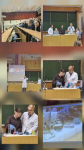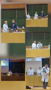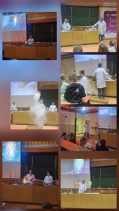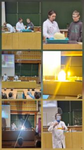 Pierwszym punktem programu były pokazy chemiczne na Wydziale Chemii UMCS. Uczniowie mieli okazję zobaczyć fascynujące eksperymenty, podczas których nauka dosłownie „ożywała” na ich oczach. Barwne reakcje chemiczne, efektowne wybuchy kontrolowane przez prowadzących oraz doświadczenia z wykorzystaniem ciekłego azotu wzbudziły ogromne zainteresowanie i zachwyt. Pokazy nie tylko dostarczyły wielu emocji, ale także w przystępny sposób przybliżyły uczniom zagadnienia z zakresu chemii.
