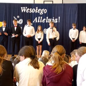 Życzenia z okazji zbliżających się Świąt Wielkanocnych wszystkim nauczycielom, pracownikom szkoły, uczniom i ich rodzicom przekazali członkowie Koła Teatralnego podczas występu artystycznego zorganizowanego w naszej szkole 1 kwietnia 2026 roku. Do życzeń dołączył się pan dyrektor szkoły oraz Samorząd Uczniowski.
