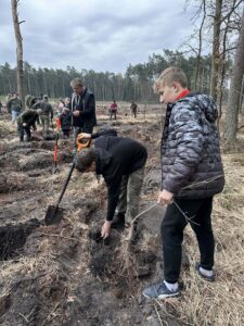 Podczas akcji uczniowie z dużym zaangażowaniem sadzili młode drzewka, ucząc się przy tym, jak ważną rolę odgrywają lasy w naszym życiu. Wspólna praca na świeżym powietrzu była nie tylko cenną lekcją ekologii, ale także doskonałą okazją do integracji oraz budowania poczucia odpowiedzialności za otaczający nas świat.