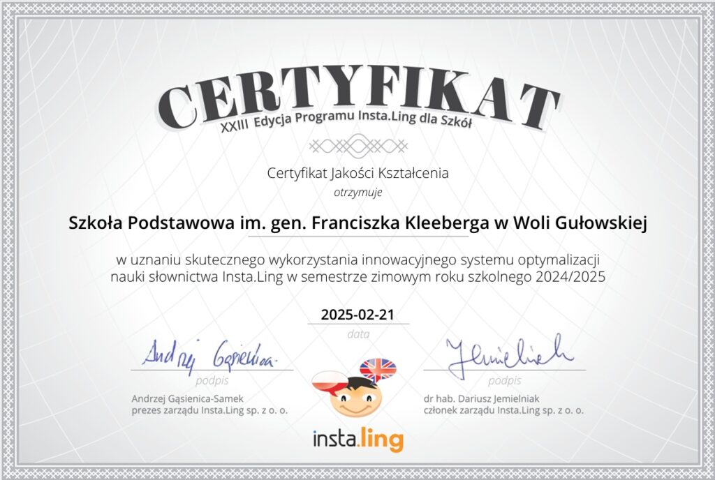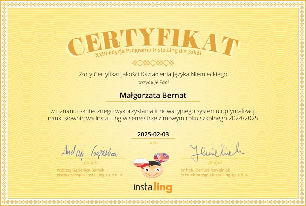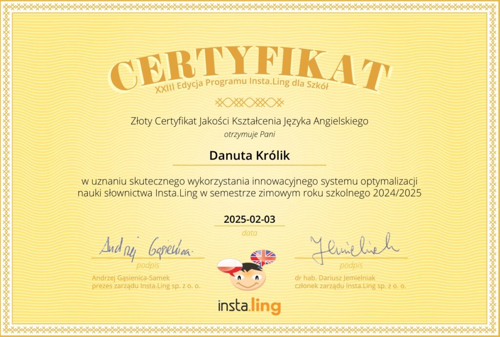 Z przyjemnością informujemy, że nasza szkoła została wyróżniona Certyfikatem Jakości Kształcenia Insta.Ling, co jest dowodem na skuteczne wykorzystanie nowoczesnych technologii w nauczaniu języków obcych. Platforma Insta.Ling, która przyznaje te certyfikaty, specjalizuje się w narzędziach wspierających dynamiczne uczenie się i efektywne zapamiętywanie materiału.