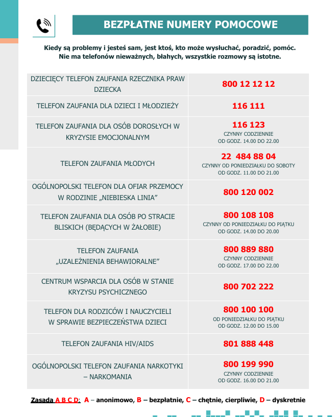 • Telefon Zaufania dla Dzieci i Młodzieży: 116 111